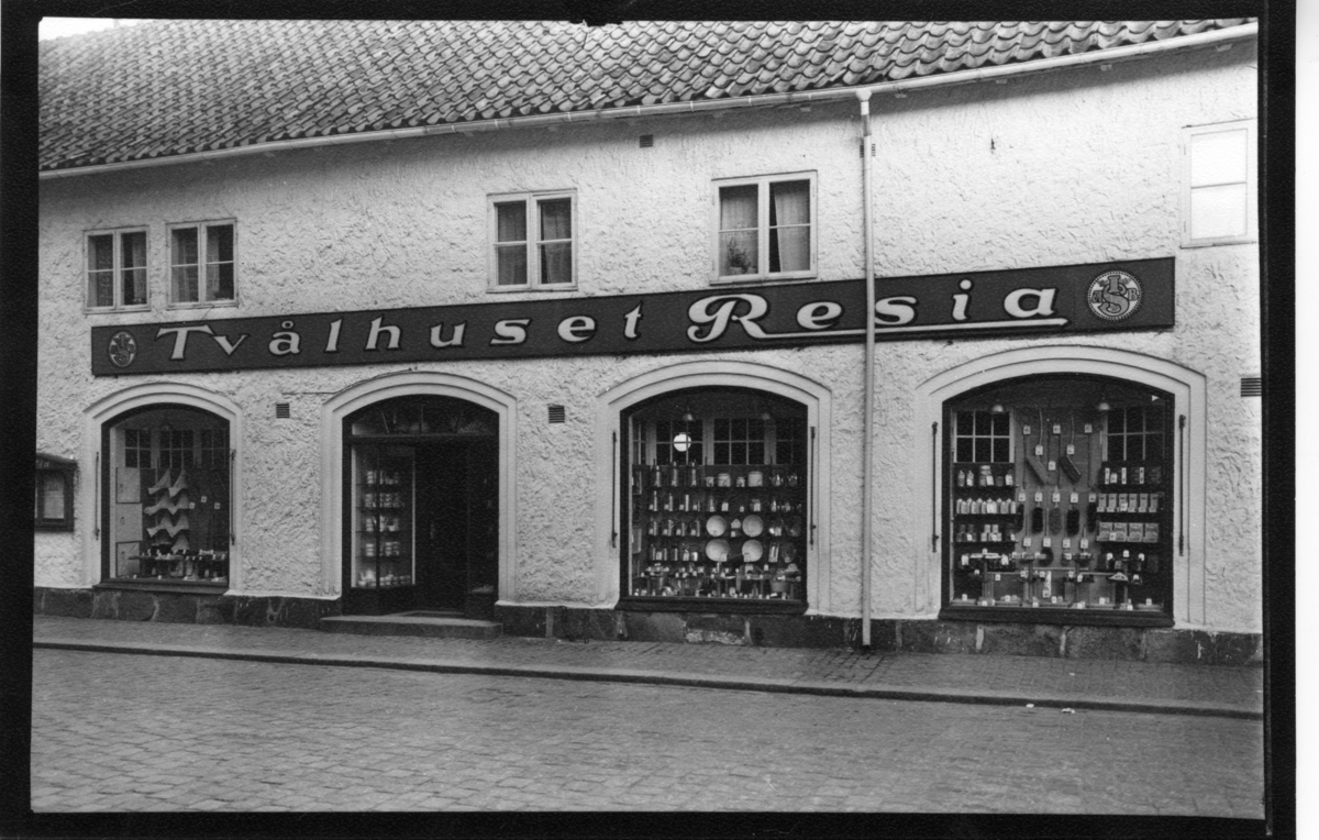 Troligen uppfört under 1700-talets första hälft av borgmästare Sören Sörenssen. Skyltfönstren tillkom 1924-1926. (försl.t.bev.pl 2). Affären "Tvålhuset Resia".