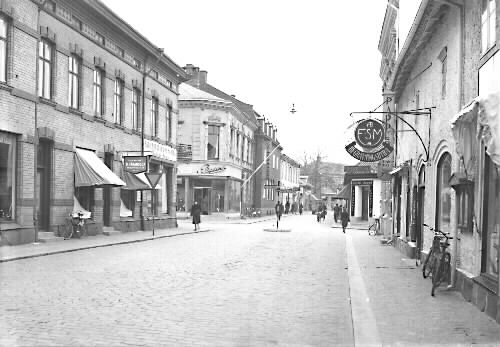 På affärsskyltarna står det A B O. Håkansson Manufakturaffär, Falkenbergs bokhandel Ragnar Pripp, Eliassons, Sparbanken, Sigfrid Larsson Specerier, Pappershandel, F.S.M Begravningsbyrå, Skepps-handel specerier, Damfrisering Hilda Andersson, A Söderström Kappor Klänningar, Aug.W. Andersson Garn Manufaktur.