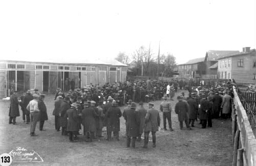 Titel: Livdjursauktion i de av staden byggda kreatursstallarna. Julius Månsson var i många år "ropare" vid auktionerna och fick en silver klubba i belöning av Hushållningssällskapet. Text A.S.