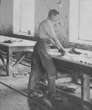 Garveriarbetare vid Läderfabriken, skrapar en hud ren med verktyget kallat skärdegen.