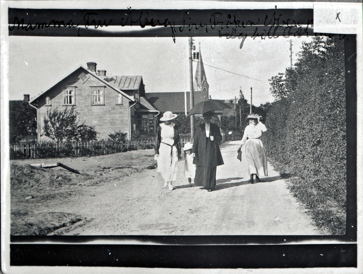 Tre kvinnor och en flicka på sommarpromenad i finkläder.