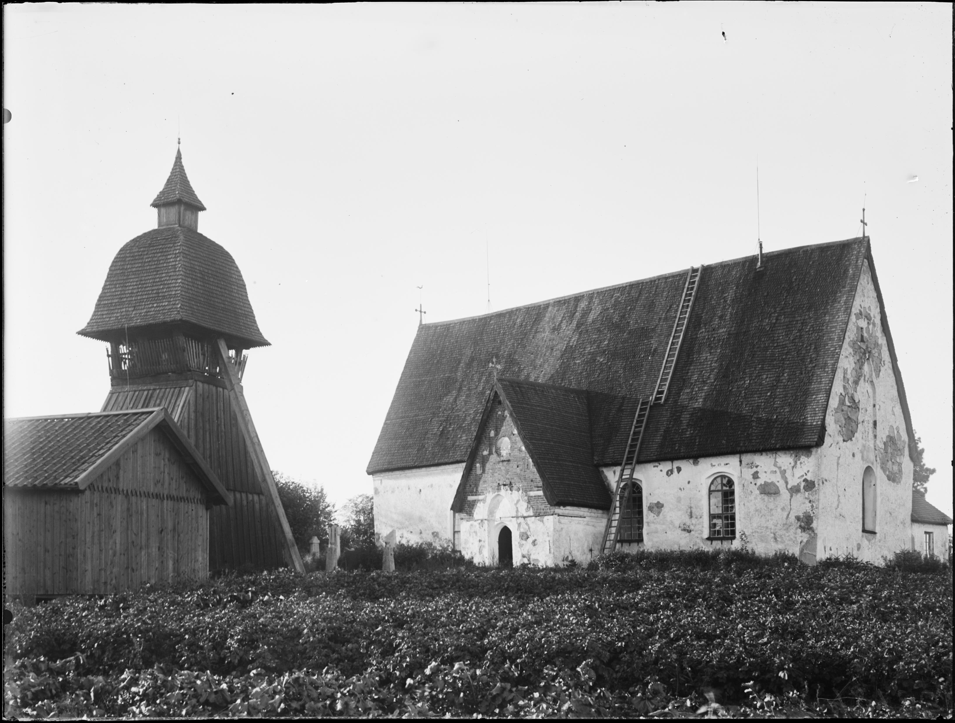Kyrkan mot sydöst med klockstapeln söder om kyrkan.