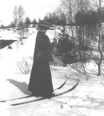 Text under bild på löst albumblad: ( på bladet fanns en lös lapp med namnet Hildur Andersson.) Att gå på skidor hörde inte till ovanligheterna. inte så lätt med kjol o. hatt.