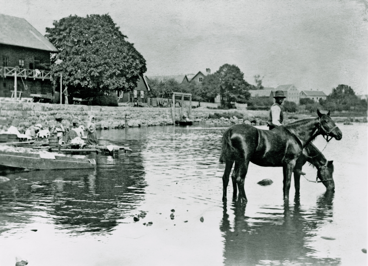 Fr.v. Lundgrens gaveri, Stenbergs färgeri, tvättflotten, L Andersens magasin. (A.S.) I bakgrunden L Andersens magasin som rivs under 1890-talet för att ge plats åt Bryggeri Falkens fabrik 1896.