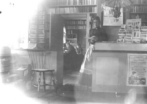 Interiör från L. Svenssons bokhandel. Om A.S. anteckningar från föregående bild stämmer bör fru L. Svensson sitta i rummet och Hildur Andersson stå vid disken. Falkenbergs första egna bokhandel var Lars Svenssons vid Storgatan (nu Björks möbelaffär). (A.S.) Numera rivet.