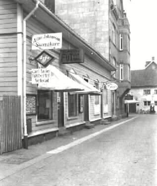 Tiden är 1934. (textkompletering E Kylén). På affärsskyltarna kan man läsa, Allan Johansson Skomakare, Carl Ander Tapetserar Verkstad, Almqvist Foto, Frisör, Elktrotekniska byrån Walter Bengtsson.