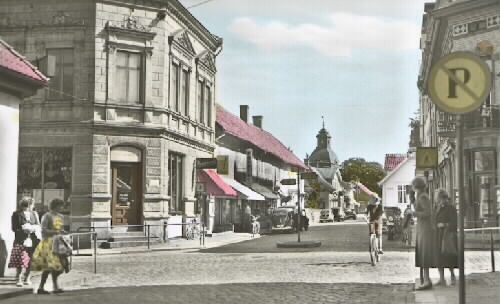 På affärsskyltarna kan man läsa, Nya AB Falkenbergs Installationsbyrå, Musikhandel, Pappershandel, Skånska Hembageriet, AB O Håkansson.