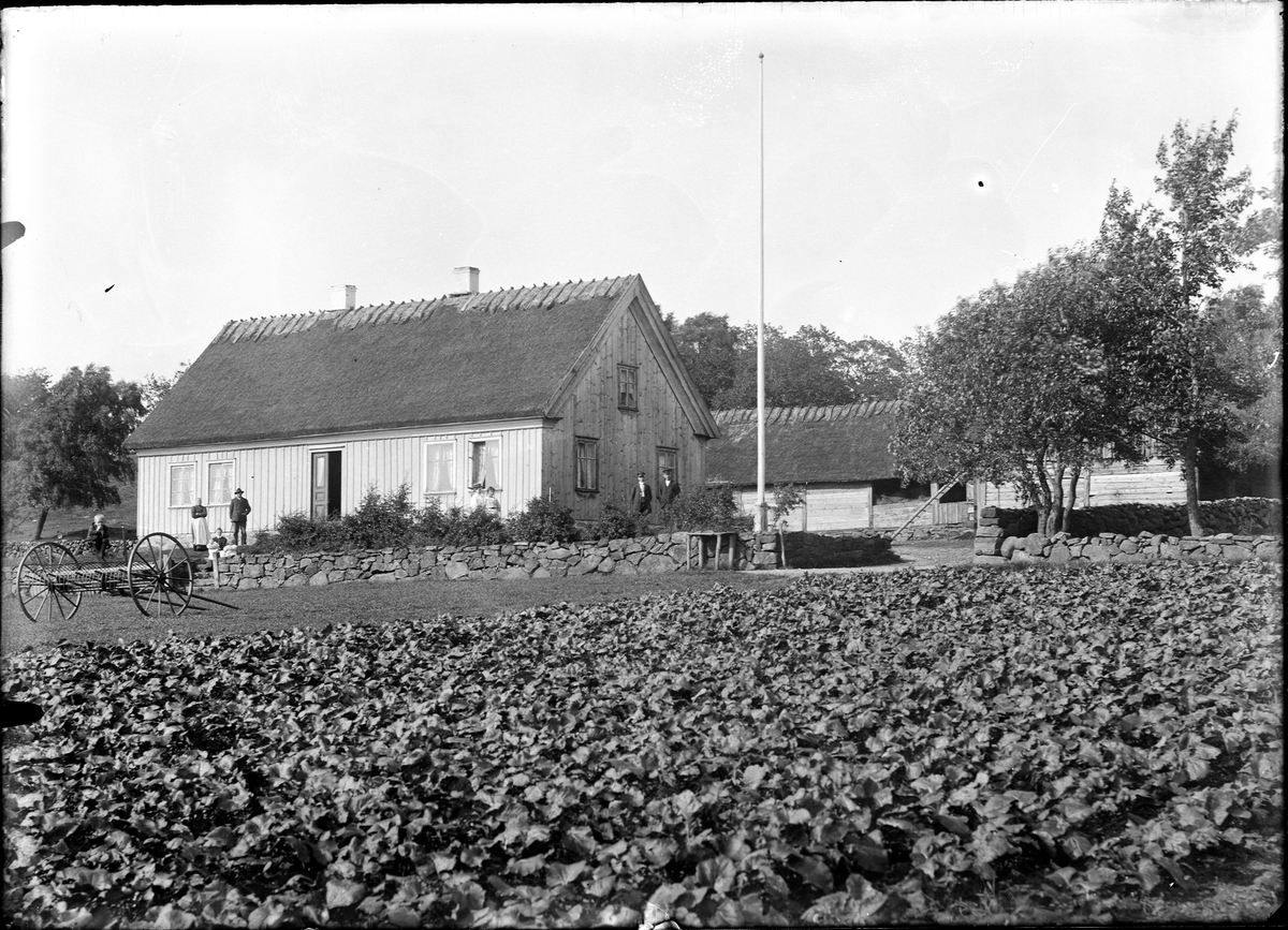 Familj framför sin gård (med vasstak) och grönsaksodling i förgrunden