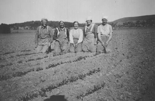 På knä ute på ett fält för att gallra betor , ett sätt att dryga ut stenhuggarlönerna. Alla tillhör de stenhuggarfamiljer i Vastadalen. Regina Johansson i mitten.