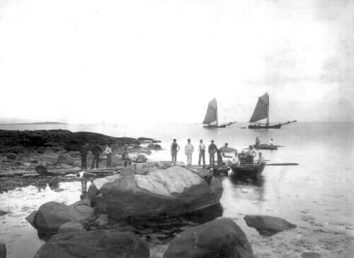 Storgatsten lastas från "hjulabår" ombord på mindre båtar för att ros ut till två väntande segelskutor för vidare transport. Sten är tagen direkt ur brott på platsen- Apelviken, Varberg. Uppgift av Einar Bengtsson fd. stenhuggare.