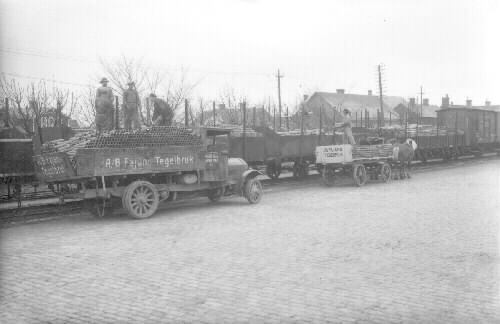 A/B Fajans Tegelbruk lastar dräneringsrör vid järnvägsstationen.