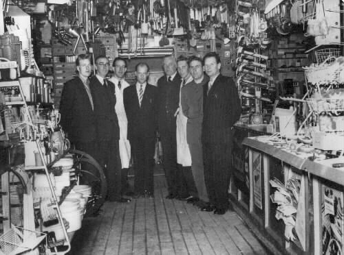 Interiör och personal från Wijklunds Järnhandel Storgatan 36. Fr.h. HOLMQVIST David, LINDQVIST Gert, x, x, ANDRÈN Daniel, uppgift saknas.