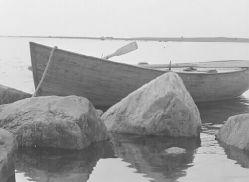 Kravellbygd träsnipa förtöjd vid några stenar, Morup Tånges fyr i bakgrunden.
