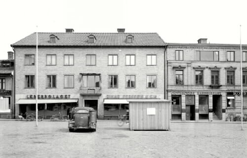 Museets kommentar: Affärsskyltar på byggnaderna i kv. Pokalen är Läderbolaget, Einar Persson & C:o, Hallands Posten, Göteborgs Handelsbank, Källare Laxen. Reg. nr på bilen är N 6117.