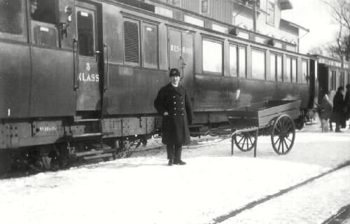 Konduktör Viktor Larsson (farbror Lasse) klar för avresa med motorvagnen som var ombyggd personvagn i vilken monterats in en begagnad flygmaskinsmotor.