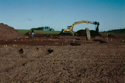Flyttning av bautasten vid utgrävningsområde Sannagård, Vinberg 1990.
