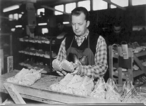 Skoarbetare Arvid Bengtsson hos Ljungsko. Han avsynar här ett par damsandaler i ormskinn från produktionen.