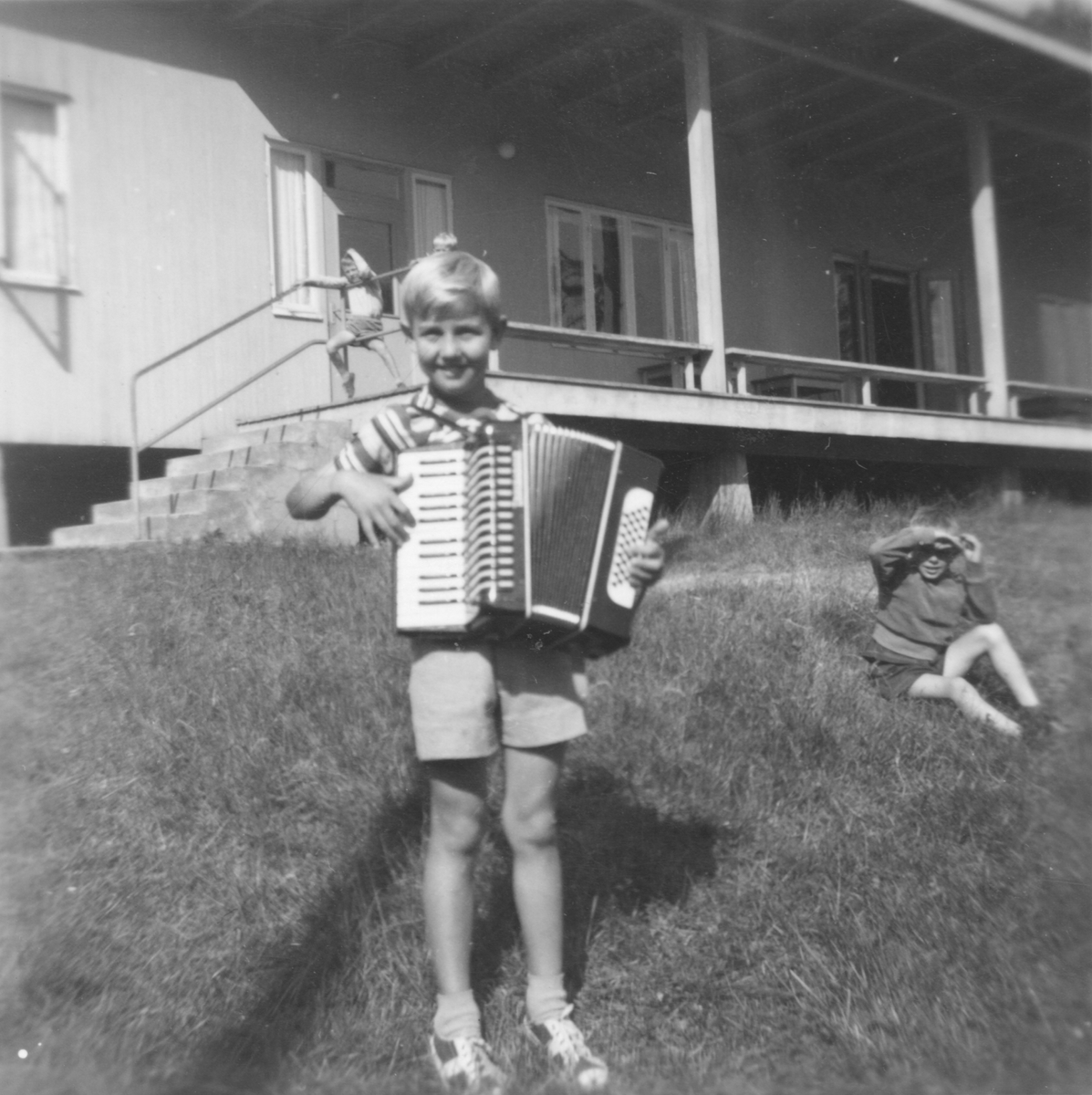 Text i album. Jag på Hackarpskolonin med mitt första dragspel juni 1955 togs kortet.