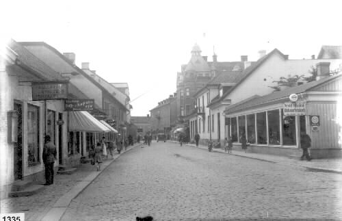 Till höger i bild ligger apoteket Lejonet, Arvid Olssons Bilverkstad, på vänster sida Hallands Nyheters tryckeri, Falkenbergs Kaffe-&konfektyraffär Thersa Johansson, Modesalongen, Nya Bazaren m.fl.