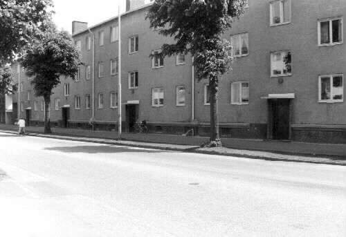 Fasaden på HSB:s 3 vånings lamellhus före renoveringen 1988. Bild 2 Hallands länsmuseer 1982