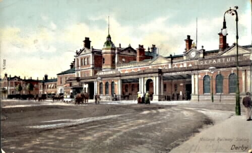 Hästdragen spårvagn utanför Midland Railway Station. Dessa hästar i England utfodrades med havre från bl.a. Falkenberg. Havereexport till England var i mitten av 1800-talet av stor ekonomisk betydelse för Falkenberg och dess framväxt.