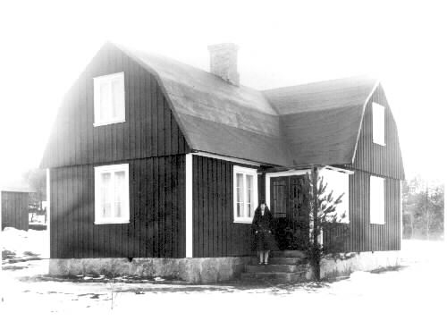 Agda bengtsson på verandatrappan till familjen hus. Hon var syster till Einar Bengtsson. Agda dog i TBC, endast 28 år gammal. På fotot är hon 23 år. Huset är byggt 1926 av Agdas o Einars far, även han stenhuggare. Obs! husets stenfot.