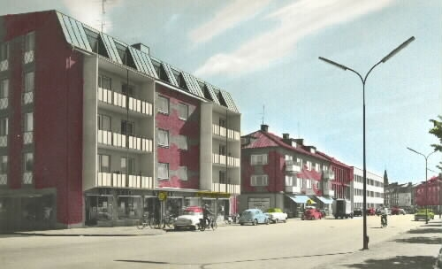 Affärer som syns på kortet, bl.a. Ny Tid, Väskan, Mattssons elaffär, Bröderna Gustavssons