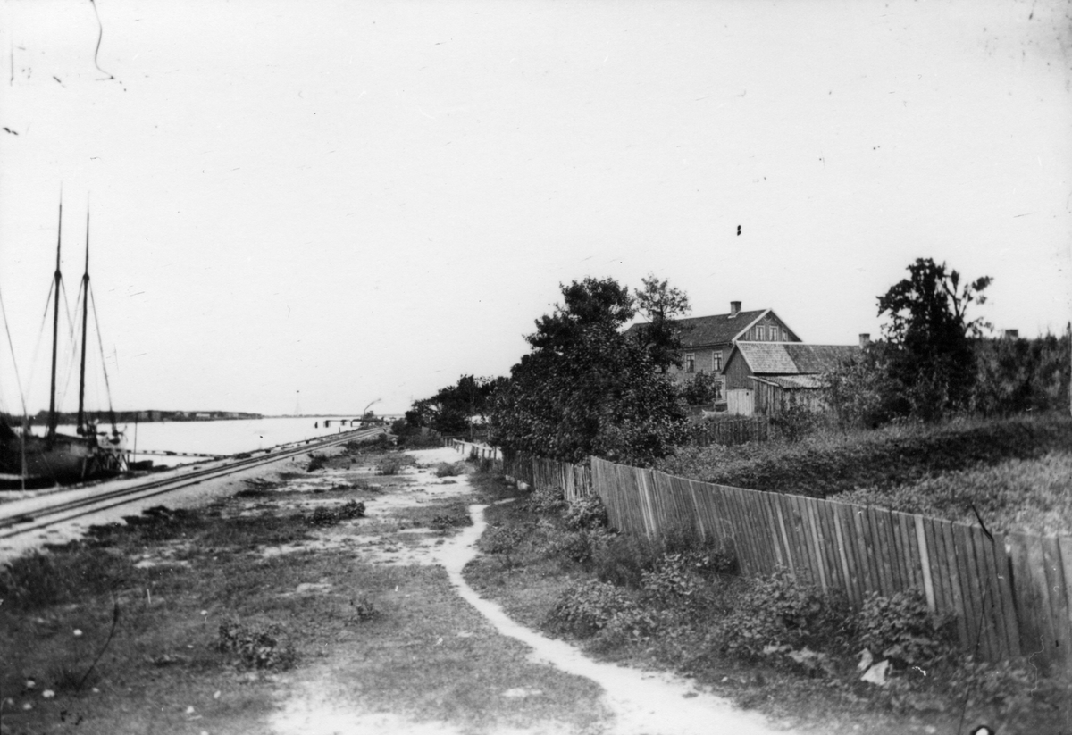 Parti av yttre hamnen. T.v. Södra sidan av inloppet med ångsågens virkeslastningsupplag och Lastans sjömärke. En ångbåt på ingående. Hamnspåret anlagt till propsgårdarna på västra sidan. Tvåvåningsbyggnaden (sedermera det såkallade kvarnkontoret) var byggt av brädgårdsinspektören Bernhard Boman. Den närmare liggande gården ägdes av målar- mästare Carl Abraham Carlstedt (redaktör C.A.G. Carlstedts hem). (A.S). En kopia i kuvert 00049 C 4.