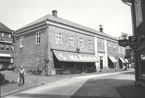 Byggt år 1851 och 1854, ombyggt 1913 och 1927. Byggherre handlanden J P Lundberg. På affärsskyltarna kan man läsa, Bröderna Wijklunds järnhandel, Elias Andersson EA kläder.