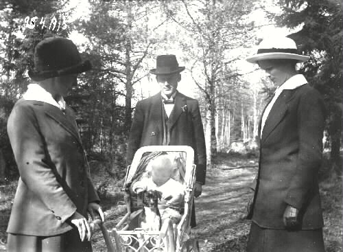 Greta i barnvagnen och Fridolf bakom. A Fridolf Persson var lärare i Årstad 1904-1912, Fritsla 1912-1920, Släp 1921-27 och Skrea 1927-41. Enl. sonen Einar Persson.