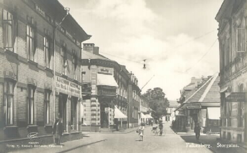 På affärsskyltarna kan man läsa, Hjalmar Kindvalls Bokhandel, Appeltoffts kläder & manufaktur, Speceri & diversehandel bröderna Scholl, Selma Wiberg Barn o beklädnadsaffär.