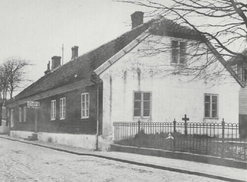 Bilden har ingått i ett inramat collage som beskriver var skolverksammet bedrivits. Tavlan har hängt i lärarrummet på Möllevägsskolan På skylten vid dörren står det Cafe Pensionat.