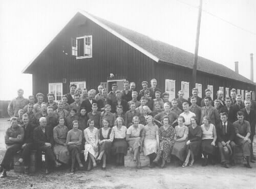 Foto. Gruppbild - Skoarbetare vid Hjalmar Svensson & Co skofabrik. Med skofabriken bakom. Skomakare Lindström i vita mustacher, hjälpt till ibland, gjorde becksöm för hand- becksömsydda kängor.