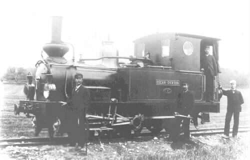 Lok nr 2 Oskar Dicksson, framför loket står från vänster LUNDSTRÖM bromsare, JOHANSSON Peter eldare, ÅBERG C P lokförare och ERIKSSON Otto lokförman. Uppgifter från boken Falkenbergs järnväg, Leif Elgh.
