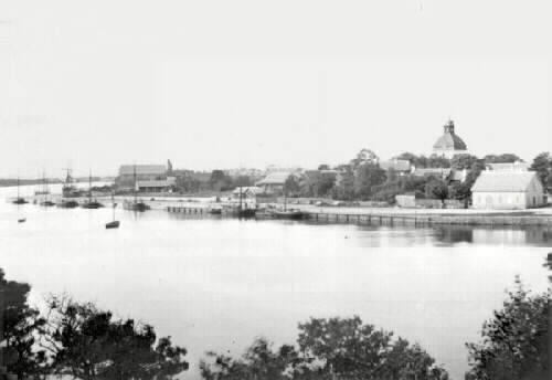 Byggnadslov för rian, Rian 10, beviljades 1883-07-27 och 1899-07-31 för ett bostadshus till vänster om tullhuset från 1870 på Laxen 17. Brandförsäkring beviljades 1882-07-22 för den byggnad, en ladugård på Slottshagen 10, som synes framför spannmålsmagasinet, nuvarande museet. den redovisas på 1878, 1888 och 1913 års kartor. Fotot visar dock en längre byggnad och ett förskjutet läge österut. Falkenberg 1999-01-18 C.E.