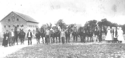 Text i album K 24: Agronom Erik Ramstedt blev 1920 ägare till Stavsjö gård i Stafsinge. Här har han radat upp gårdens drängar och pigor och hästar för fotografering. Ramstedt var den driftigaste av Stavsjös ägare. Före honom arrenderades gården av J. Frank. Ägare till gård och tegelbruk var den i Falkenberg namnkunnige apotekaren C J Brag, han som bestämde i stan så det hette " Bragen har sagt det".