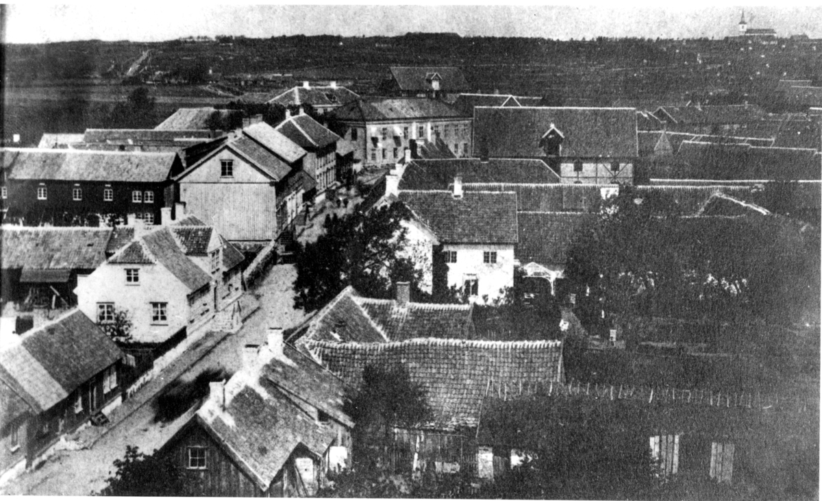 Storgatan norrut sedd från S.t Laurentii kyrktorn. Bakom borgmästaregården (Kronan 19) ses korsvirkesmagasinet, där stadshuset nu ligger, och till vänster gamla rådhuset. Framför den till vänster liggande uthuslängan ligger det sk. "Hotell Codrington". Bild nr:2 i album K 24, Falkenbergs museum, enl uppgift även en kopia på Hallands Nyheter. Bild nr:3 i Kommunarkivet, FBG. "blått album", samt två kopior i Bratt albumet, dessa tre med något olika maskeringar.