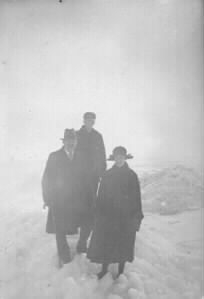 Carl Kronvall, smed vid järnvägen med maka Hilma och dottern i skärmmössa. Text på baksida av foto: Vintern 1922 på ett isbergen.