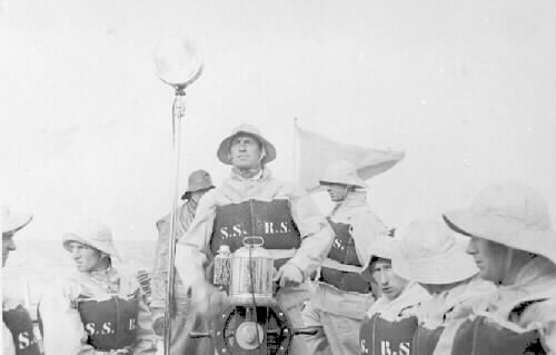 Ombord på räddningsbåten Adolf Bratt. Befälhavare på båten Sven Andersson står till rors. Från v. MÅRTENSSON Bror, Oskar JÖNSSON, okänd, ANDERSSON Sven, Erik MÅRTENSSON, Edvind CLAESSON och KARLSSON Wilhelm.