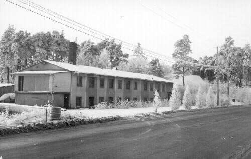 Ljungsko skofabrik. Tillverkningen skedde på nedre våningen. Ovanvån. - packlokaler. Huset nedsänkt låga fönster i förhållande till markplan. Hilding B jobbade här under åren 1947-1972. Lades antagligen ned 1972.