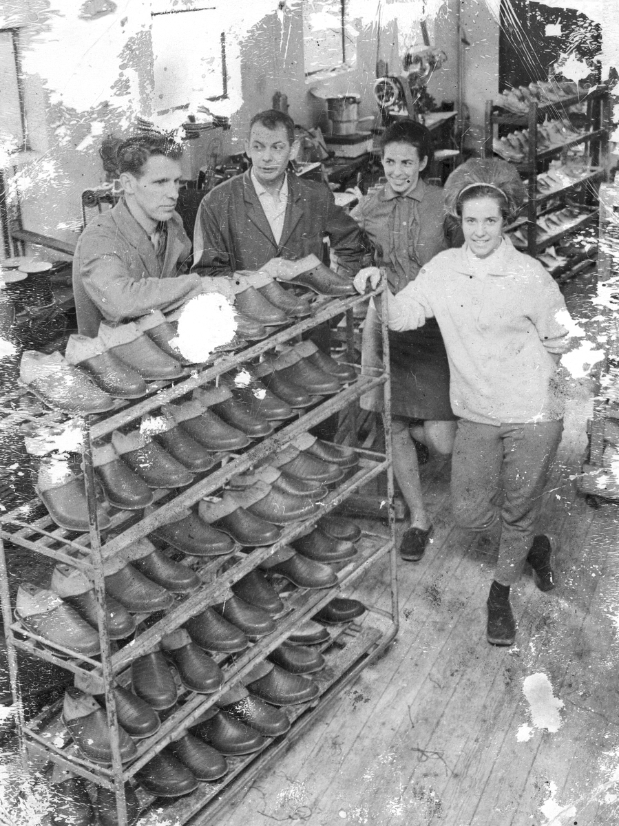 AB C G Johanssons skofabrik, ofta benämnd Slättens skofabrik. Fyra skoarbetare vid skoställ med slippers. Fr.v. Åke Johnsson, Bror-Erik Ekenhard (tidigare Nilsson), ?, Ann-Britt ?. Bror-Erik ägde fabriken tillsammans med brodern Ingemar Nilsson.