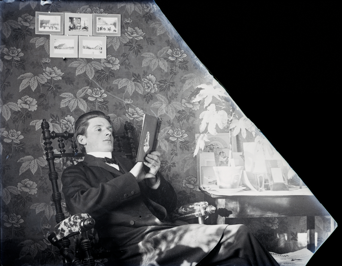 Läraren A Fridolf Persson sitter läsande en fåtölj i vardagsrummet.