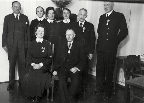 Text i album: Fagereds sanatorium jubilerar. Utdelning av förtjänstmedaljer vid Fagereds sanatorium. Alfred Johansson andra fr h stående, bild 1. Första från vänster.