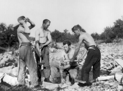 Stenhuggare i "Bolagsberget" Mannaberg Skrea, borrning av spränghål med borr och slägga. 3 man med släggor 1 med stenborr. Uppgift av Einar Bengtsson fd. stenhuggare.