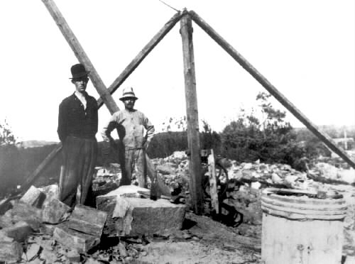 Stenhuggare i "Bolagsberget" Mannaberg Skrea, t.v. Johan "Halland" mannen t.h Alexander Larsson. Uppgift häftet Stenhuggarna i Skrea