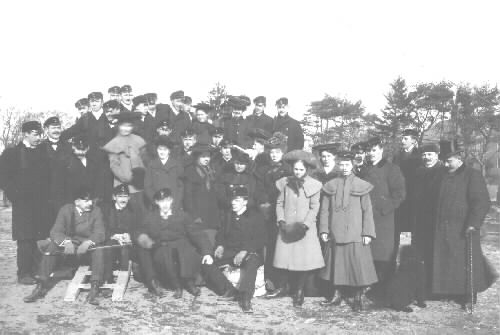 Fältström har berättat om detta kort, taget utanför Hertings Gård efter 1905. Chalmerister i Fbg var då Einar Thune, som är med på bilden samt systern Elsa Thune, som blev skolköks- lärarinna, Eric Lindvall, Minnie Boman i profil, en lärarinna vid Samskolan, Elin Svensson, suddig, Harry Hallberg i hög hatt och käpp, Tekla Fältström eller Frida Fältström, Sally Nyman. (A.S.)