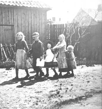 Skolbarn leker på "stigen" vid Fältstöms. "Lyckans stig" bakom Fältstöms plank. Huset i bakgrunden troligen Lindwalls hus, f.d. 126 b, Låset 2, Brännungen 14. Det enda "original" som vi lyckats att finna är en spegelvänd kopia (se texten på tidningen, Falkenbergs Tidning), jämför även omgivningar med bild nr. 00044. Bilden är nu reprofotograferad vilket medfört att vi erhållit ett spegelvänt negativ, vilket noga bör observeras vid kopiering. Enligt uppgift lär glasplåten finnas på Halmstads museum.