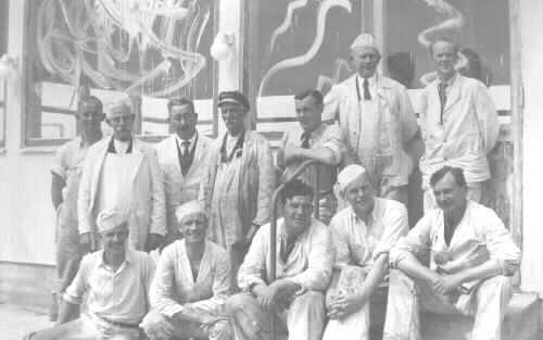 Målning av Strandbaden, målare från Lundgrens målerifirma. Främre raden fr.v. Nils Nilsson, Erik Gustavsson, Bror Pettersson Karl Johanssson Nils P Bergström. Bakre raden fr.v. Gunnar Mårtensson, Karl Josefsson Ludvig Rotoff, August Bengtsson, Jarl Bengtsson, Elvén (duktig målare), Karlsson. Person uppgifter från Erik Gustavsson, juni 1998.