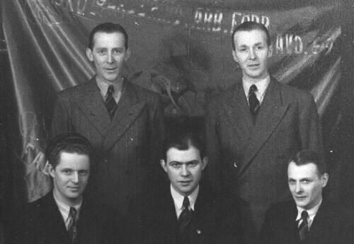 Styrelsen i sko&läder avd. 69 i Falkenberg. Överst fr. v. PERSSON Axel, S A Svensson, stansare, styrelseledamot senare ordförande i Metall, PERSSON Gunnar, Hj Sv skofab snittfräsare, kassaredogörare, betalade ut A-kassa, ARVIDSSON Verner, Hj Sv skofab snittfräsare, kassör i styrelsen, PETTERSSON Karl, Hj Sv skofab, avlappare, orförande i avdelningen, ERLANDSSON Erik, Falkenbergs skofabrik, sträckare och pinnare, sekreterare i avd.