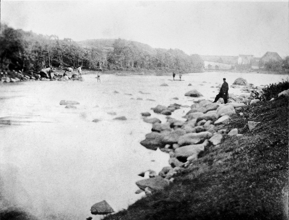Garvareforsen och Tullbron sedda från Ätrans nordvästra strand. På motstående sida av älven sträcker sig Doktorspromenaden. På kartongen från fotots baksida fanns följande text: Vid Garvareforsen, foto av Fredrik Bratt som synes längst till höger taget 1845 (?) 1861. Första fotografiet i Fbg (?). Denna text av Anna Skantze,är ej bekräftad så man bör taga uppgift- erna med stor försiktighet. Ytterligare en "äldre" kopia finns i kommunarkivet i "blått album" något olikt maskerat.
